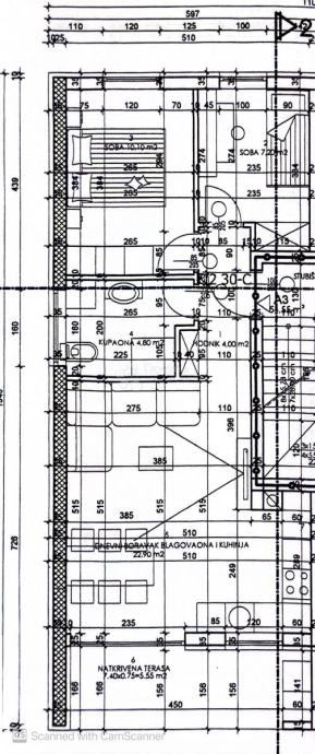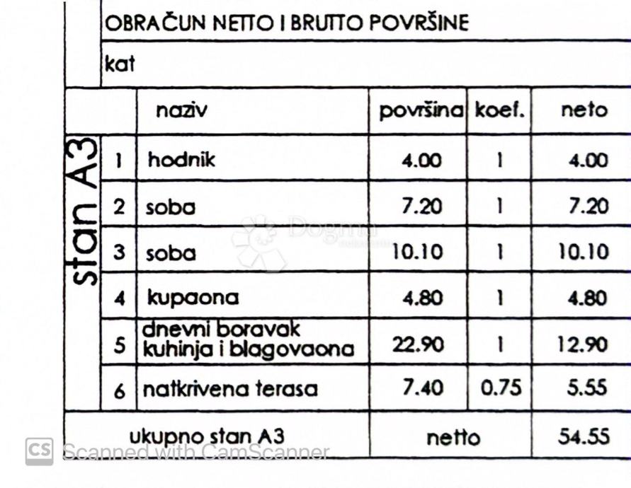 U ponudi je stan A2 na prvom katu zgrade A, s dvije spavaće sobe, prostranim dnevnim boravkom i kuhinjom (ukupno 22,90 m2), kupaonicom (4,80 m2) te natkrivenom terasom 7,40 (obračunato 5,55 m2 po koeficijentu).