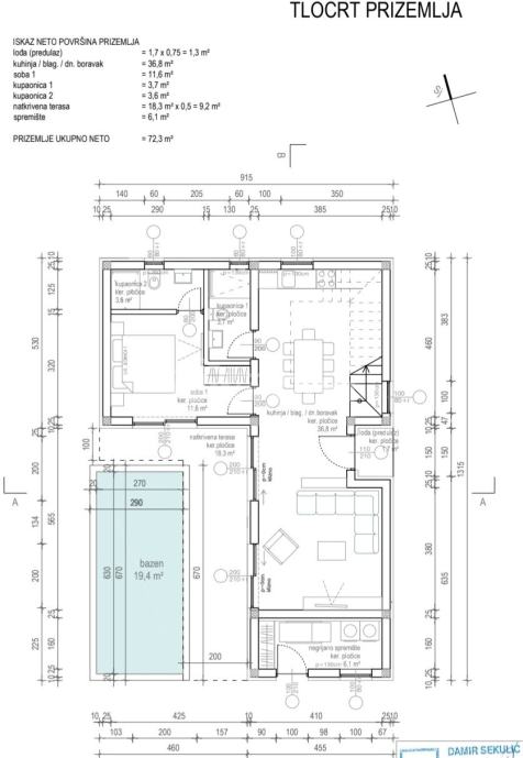 Prizemlje: Kuhinja s blagovaonicom i dnevnim boravkom, kupaona, jedna spavača soba s kupaonicom, s natkrivenom terasom povezana s vanjskim bazenom 19,4 m2. Ostava 6,1 m2.