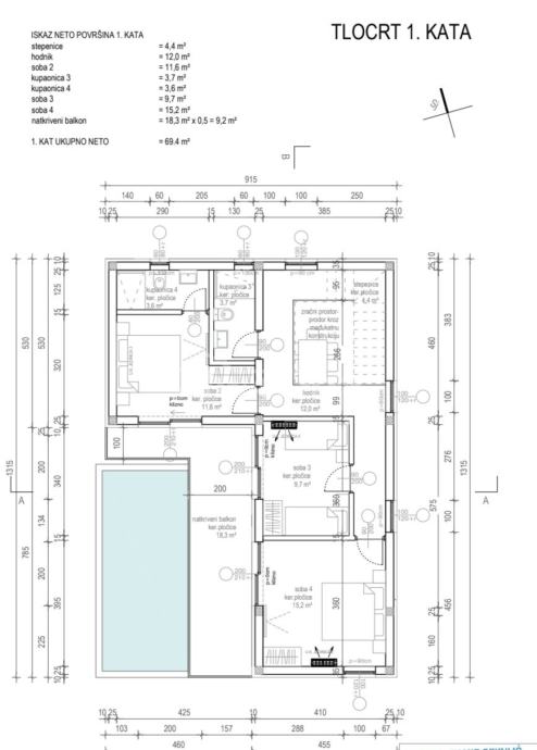 Kat unutarnje stepenice, tri spaveće sobe, dvije kupaonice, natkiveni balkon.