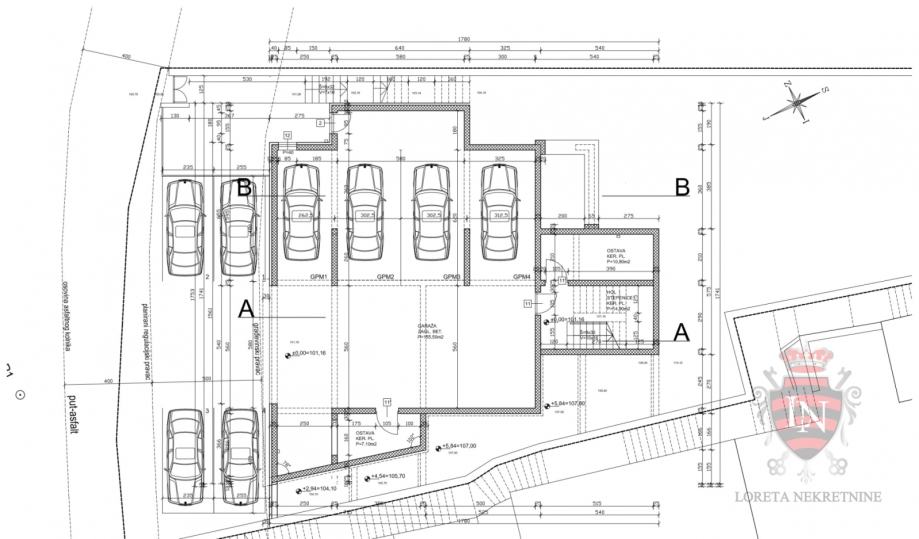 Predviđene su 4 garaže i 4 parkirna mjesta čija kupnja nije obavezna. Garaže su u prizemlju, tako da se stan S3 nalazi na 1. katu, ali je dojam kao da je na 2. katu.