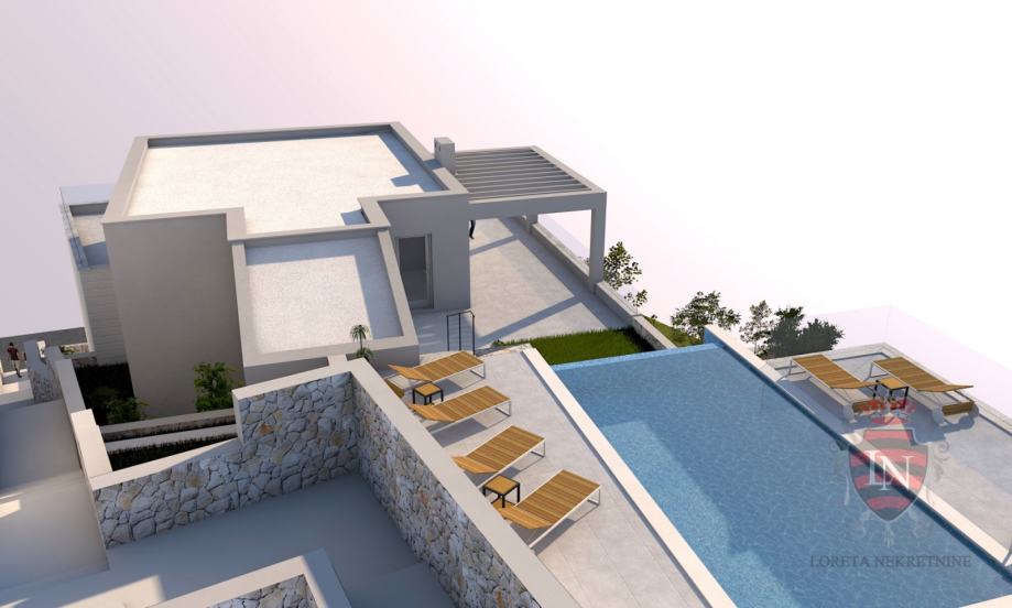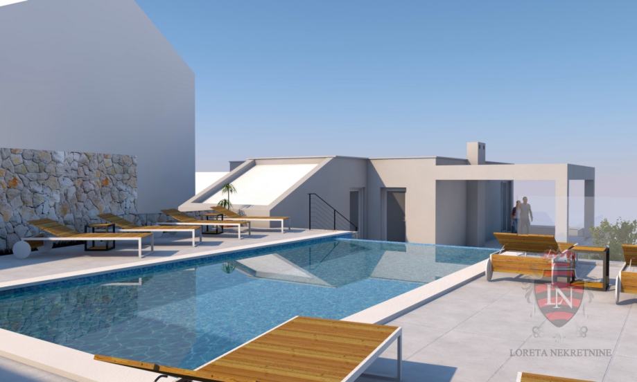 NOSIVA KONSTRUKCIJA je planirana sustavom nosivih armirano-betonskih zidova debljine 18 cm. Pregradni zidovi projektirani su u sustavu gips-kartonskih zidova debljine 10 i 12,5 cm. Međukatna konstrukcija izvest će se punim armirano-betonskim stropnim pločama debljine 20 cm odnosno 22 cm. Temeljna ploča izvodi se u debljini 50 cm, a krovna ploča i terasa u debljini 20 cm. Završne obrade podova su u standardnoj izvedbi ovisno o namjeni prostora.