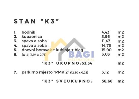 Navedeni stan na prvom katu zgrade se sastoji od dvije spavaće sobe, kupaonice, dnevnog boravka sa kuhinjom i blagovaonicom površine 56.77m2. Stan će biti opremljen sa klima uređajima u sobama i podnim grijanjem u kupatilu.