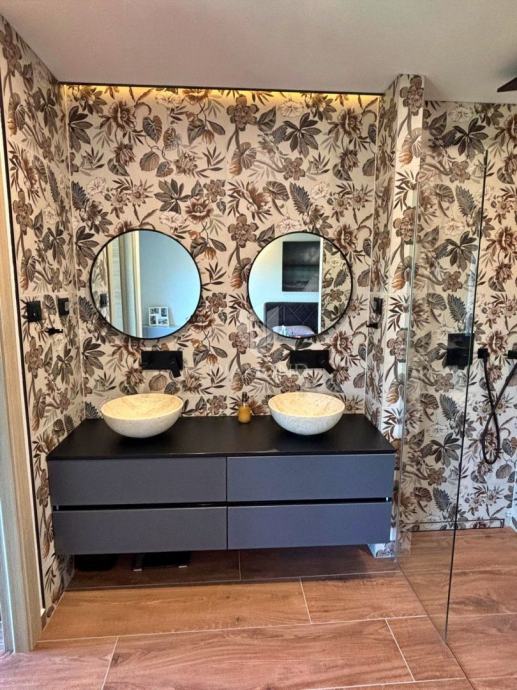 Kuća se prostire na dvije etaže. U prizemlju se nalazi prostrani dnevni boravak povezan s kuhinjom i blagovaonicom u open space konceptu, dodatni WC te praktična ostava. Na katu su smještene tri komforne spavaće sobe, svaka s vlastitom kupaonicom, što osigurava maksimalnu privatnost i udobnost.