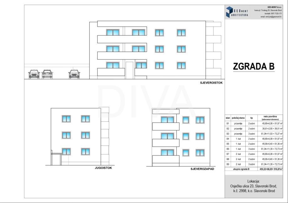 Zgrada je katnosti prizemlje + 2 kata, s ukupno 9 stambenih jedinica i pripadajućim parkirnim mjestima, projektirana prema suvremenim standardima gradnje.
