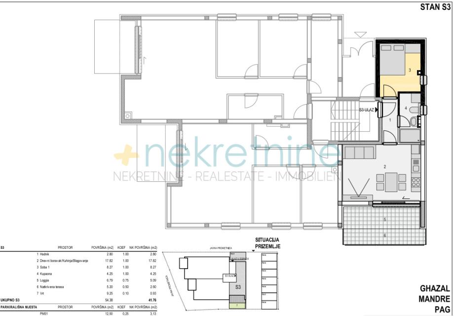 U ponudi je stan S3 smješten u prizemlju moderne stambene zgrade u izgradnji, na ekskluzivnoj lokaciji – prvi red do mora, u mjestu Mandre na otoku Pagu.