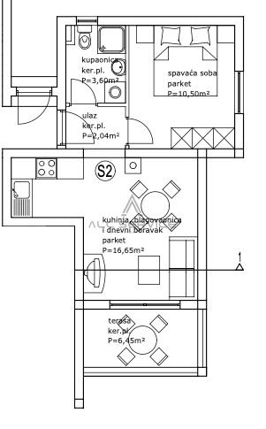 Stan se sastoji od ulaznog hodnika, prostranog dnevnog boravka i blagovaone, terase i spavaće sobe.