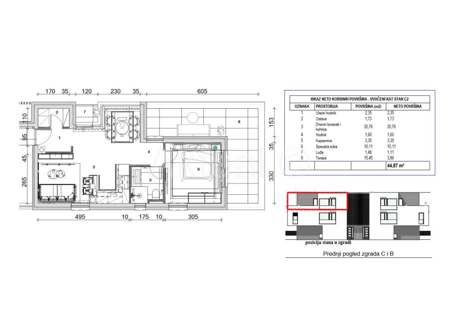Stan C2 nalazi se zadnjem (drugom) katu zgrade C, ima neto ukupnu površinu 44.87 m2 te se sastoji od ulaznog prostora/hodnika, kuhinje i dnevnog boravka, spavaće sobe, ostave i kupaonice. Stanu pripada lođa površine 1.48 m2 i terasa površine 15.45 m2 koji je uključen u obračunu neto kvadrata.