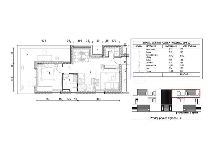 Stan B2 nalazi se zadnjem (drugom) katu zgrade B, ima neto ukupnu površinu 44.87 m2 te se sastoji od ulaznog prostora/hodnika, kuhinje i dnevnog boravka, spavaće sobe, ostave i kupaonice. Stanu pripada lođa površine 1.54 m2 i terasa površine 15.34 m2 koji je uključen u obračunu neto kvadrata.