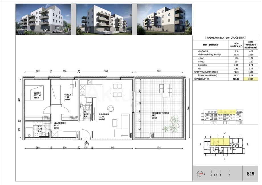 Stan oznake S19 nalazi se na zadnjem katu zgrade, ukupne površine 83 m2 a sastoji se od ulaznog prostora/hodnika, kuhinje, blagovaonice i dnevnog boravka, 2 sobe, kupaonice, wc-a i terase.