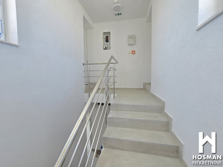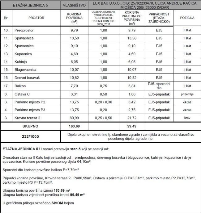 Stan se sastoji od hodnika, kuhinje s blagovaonom i dnevnim boravkom, kupaonice, 2 spavaće sobe i balkona. Stanu pripada krovna terasa oznake KT2 površine 80.99m2 s koje se pruža prekrasan pogled na grad i more, spremište oznake C površine 3.31m2 u prizemlju zgrade, te 2 vanjska parkirna mjesta oznake P2 i P3 površine 13.75m2.