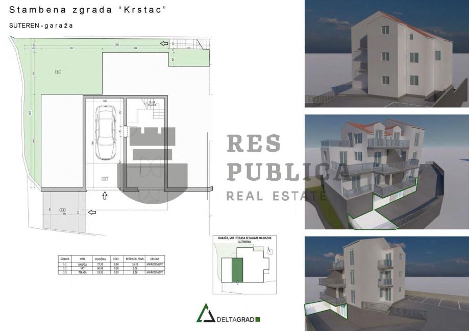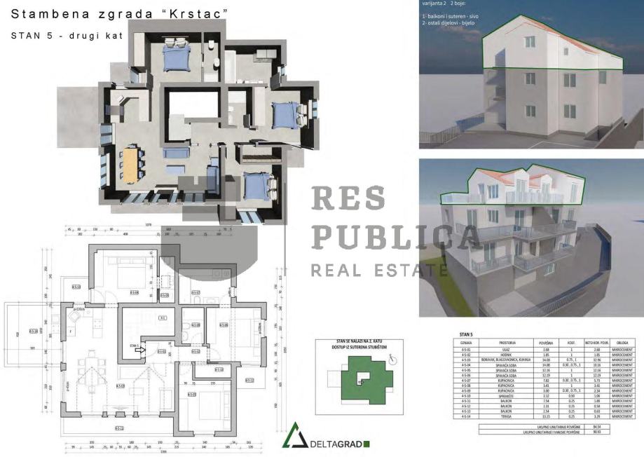 Ovaj moderan trosoban penthouse s terasom i tri balkona, ukupne površine 93,43 m2, zauzeo je potkrovlje stambene zgrade koja ukupno ima 5 stanova raspoređenih na 4 etaže. U suterenu zgrade se nalazi ulaz, šupe i garaža a na ostale dvije etaže su smještena po dva stana.