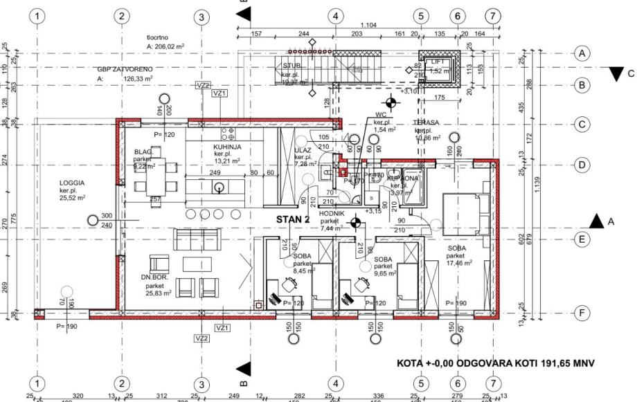 SVEUKUPNA OBRAČUNATA POVRŠINA: 116,81 m2 + garaža 9,52 m2 (19,04 x 0,5) + VPM 3,13 m2 (12,51 x 0,25) = 129,46 m2