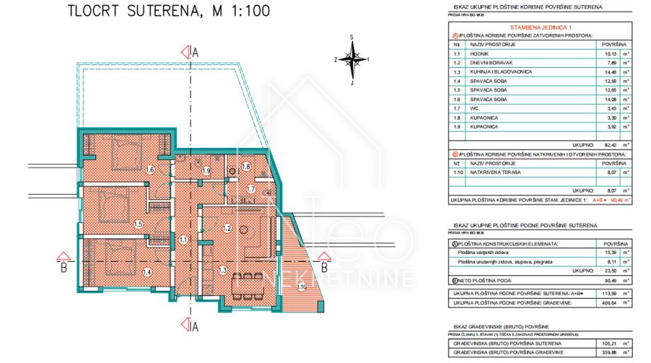Stan S1 se nalazi u suterenu zgrade, bruto površine 335,49 m2. Sastoji se od hodnika, kuhinje i blagovaonice, dnevnog boravka, tri spavaće sobe (od kojih jedna s vlastitom kupaonicom), dvije kupaonice, WC-a. Iz dnevnog prostora se izlazi na natkrivenu terasu od 8,07 m2 te u vrt površine 245 m2.