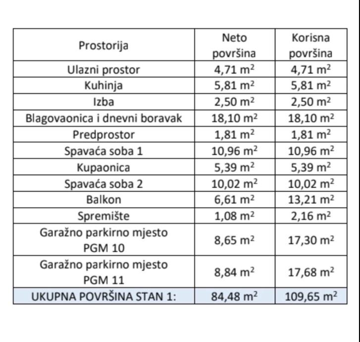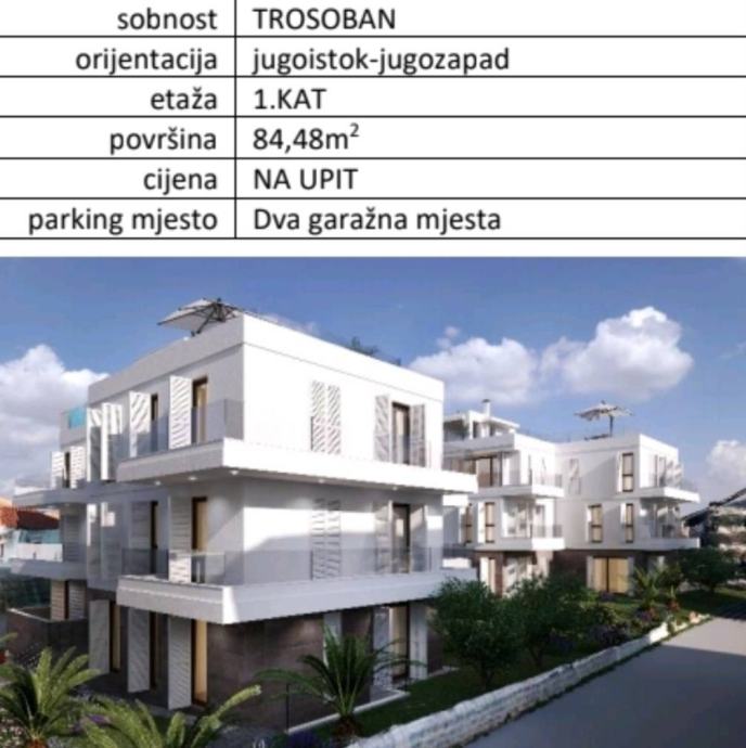 Imamo u ponudi stan u kvalitetnoj novogradnji sa dva garažna mjesta, stan je ukupne površine 109,65m od tog stambeno je 84,48m2, sastoji se od dvije spavaće sobe,.dnevnog boravka, kuhinje, kupaonice, hodnika, balkona od 13m2 koji se proteže na dvije strane zgrade i sa kojega se pruža predivan pogled na more!!
