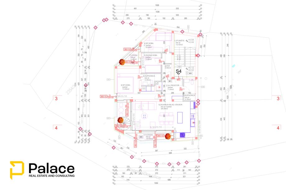 Stan stambene površine 83 m2 ima ulazni prostor, open space dnevni boravak, kuhinju i blagovaonicu površine 29,29 m2 s predivnim pogledom na grad i tvrđave, dvije spavaće sobe jedna od 8,03 m2 te druga 13,85 m2, jednu radnu sobu površine 5,88 m2, hodnik, dvije kupaonice te dvije lođe (jedna površine 10,83 m2 i druga od 3,48 m2). Posebnost ovog stana svakako je prekrasna, nenatkrivena terasa površine 40 m2 koja se nalazi na etaži iznad stana i pruža predivan pogled na sve strane svijeta. Tako vam u srcu grada ovaj divan, moderno osmišljen stan nudi pravu zelenu oazu te potpuni mir i privatnost. Predviđeni završetak je kraj 2026. godine, a nekretnina će biti opremljena podnim grijanjem u kupaonicama, klima uređajima u svim prostorijama, ALU stolarijom, električnim roletama. Stanu pripada i parkirno mjesto, te je zbog svega navedenog stan vrhunska investicija za moderan način života u samom centru grada.