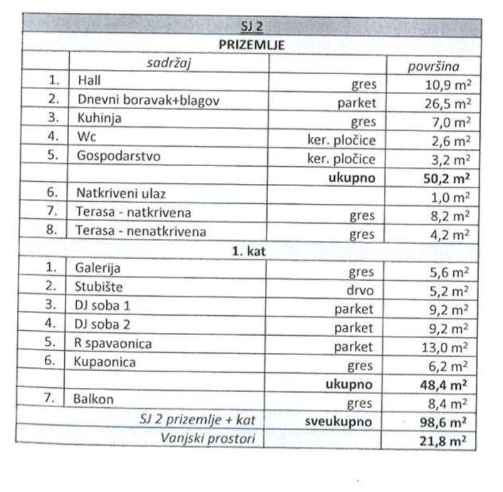 Kuća se satoji od: Ulazni hodnik, gospodarstvo, WC, kuhinja+blagovaona+dnevni boravak s izlazom na natkrivenu terasu i KAT: galerija, stubište, dvije dječje sobe, spavaća soba, kupaonica i balkon.