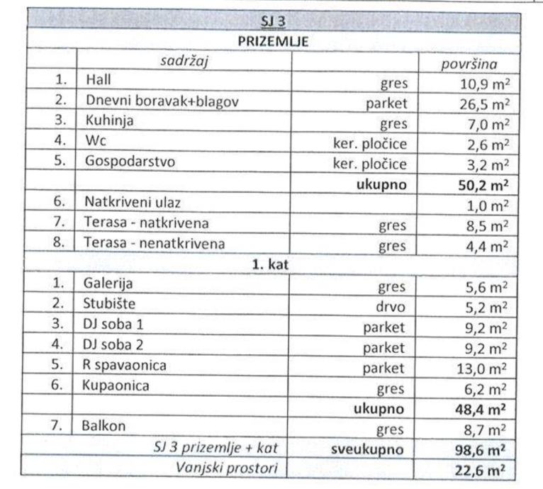 Kuća se satoji od: Ulazni hodnik, gospodarstvo, WC, kuhinja+blagovaona+dnevni boravak s izlazom na natkrivenu terasu i KAT: galerija, stubište, dvije dječje sobe, spavaća soba, kupaonica i balkon.