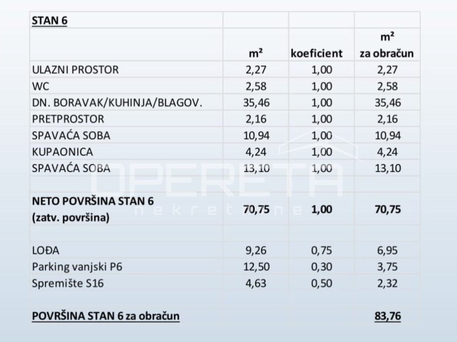 Stan S6 nalazi se na prvom katu zgrade. Sastoji se od 2 spavaće sobe, kuhinje, dnevnog boravka i blagovaonice, kupaonice, toaleta te hodnika. Pripada mu i loggia površine 9,26 m2, spremište te vanjsko parkirno mjesto.
