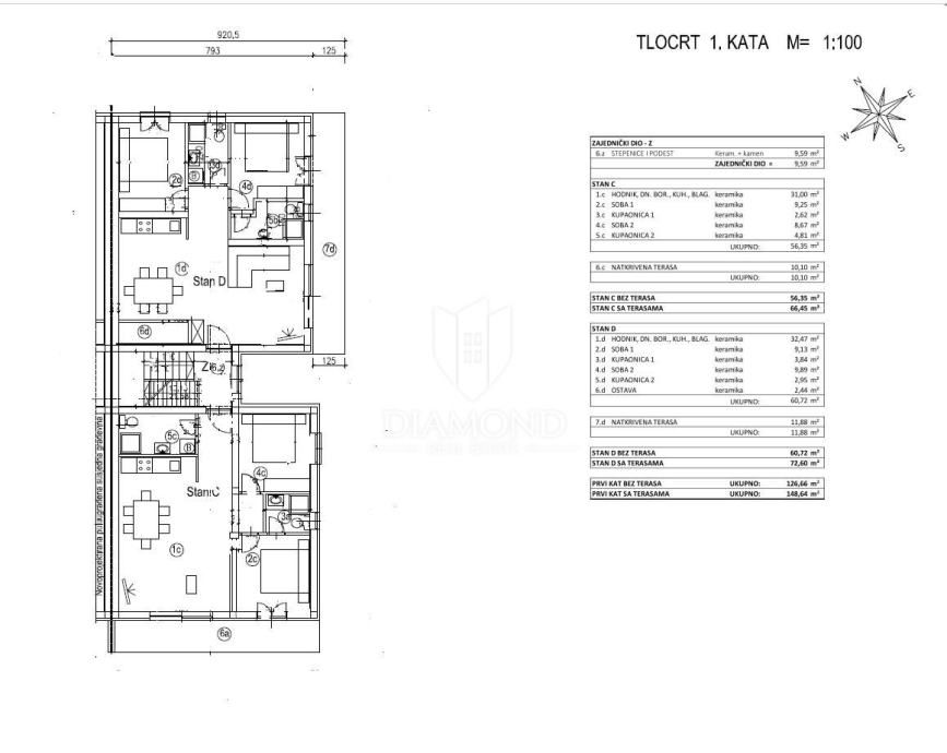 Stan se smjestio u prizemlju manje zgrade od svega 4 stana. Stan je ukupne površine 72m2 i sastoji se od 2 spavaće sobe, 2 kupaonice, kuhinje i dnevnog boravka iz kojeg se izlazi na terasu sa koje se prostire panoramski pogled na more. Stan ima podno grijanje i klima uređaje pomoću kojih je također moguće i grijanje i hlađenje. Stanu prpada spremište i jedno parkirno mjesto sa napajanjem za električno vozilo.