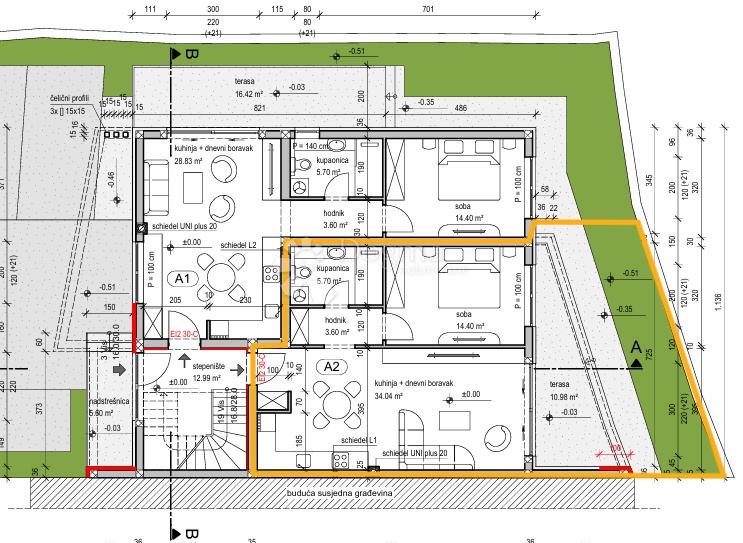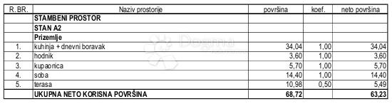 Stan “A2” smješten u prizemlju, ukupne netto površine sa koeficijentima 63.23 m² sa izvrsno osmišljenim rasporedom:
