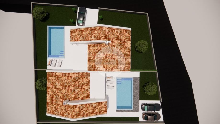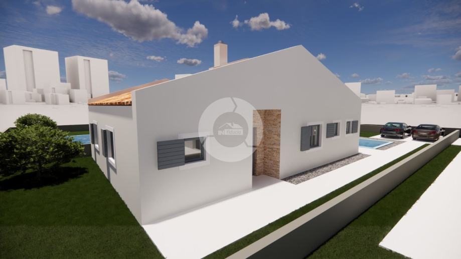 Investitor kreće u gradnju četiri prizemnica u nizu u jednom malom istarskom gradiću nedaleko od Poreča (10 km) i sadražaja mjesta (1 km). Lokacija je vrlo mirna, okružena prirodom. Kuća se sastoji od ukupno tri spavaće sobe i dva kupatila, strojarnice/spremišta, kuhinje, blagovaone i dnevnog boravka sa izlaskom na natrkivenu terasu od 20,9 m2. Kući pripada okućnica od cca 450 m2 u kojoj je predviđen bazen od 27 m2, terasa, uređeni vrt i parking (netto okućnice ostane oko 300 m2). Grijanje/hlađenje će biti putem klime, a grijanje je predviđeno i podno na stuju. Stolarija je PVC sa troslojnim staklom i električnim roletnama. Idealan je odabir za one koji vole prizemnice, koji ne žele veliku površinu za održavanje i koji vole mirne lokacije.