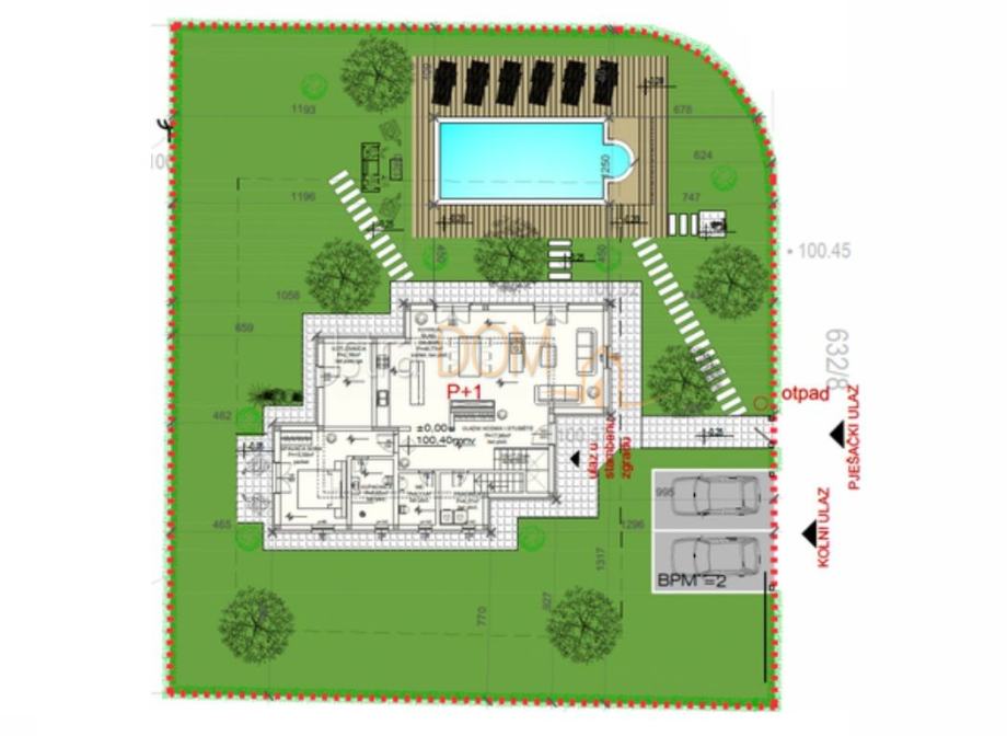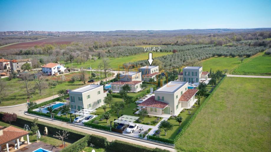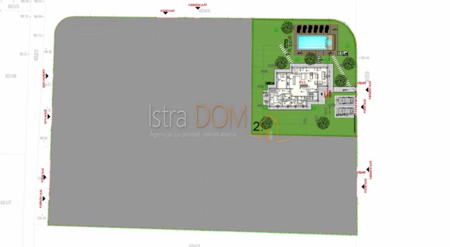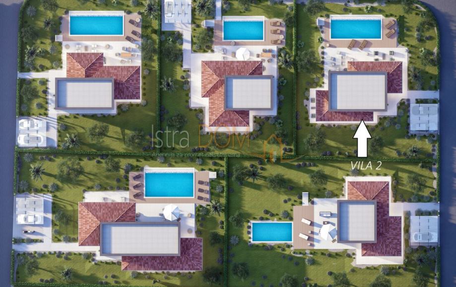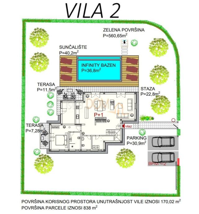 - okućnice površine 710 m2 s infinity bazenom (37 m2), dvije terase (12 m2 i 7 m2), sunčalištem (40 m2), stazom (23 m2), zelenom površinom (560 m2) te parkirnim mjestima (31 m2).