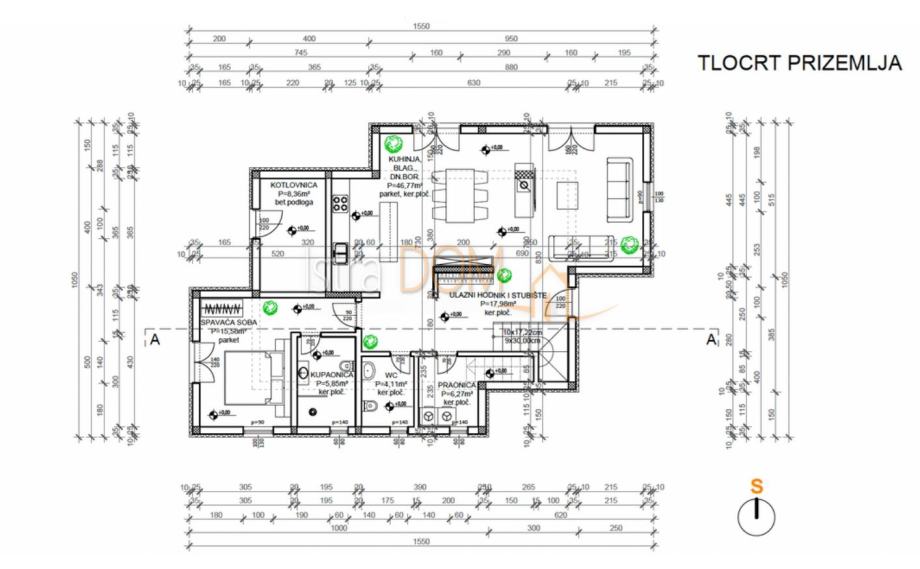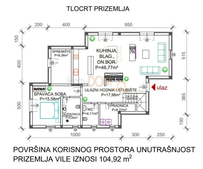 - prizemlja površine 105 m2 gdje se nalazi dnevni boravak s kuhinjom i blagovaonicom, spavaća soba s vlastitom kupaonicom, praonica, gostinjski wc te kotlovnica. Ovaj dio kuće ima izlaz na vanjski bazen i sunčalište s natkrivenom terasom, na nenatkrivenu terasu, vrt te natkrivena parkirna mjesta.