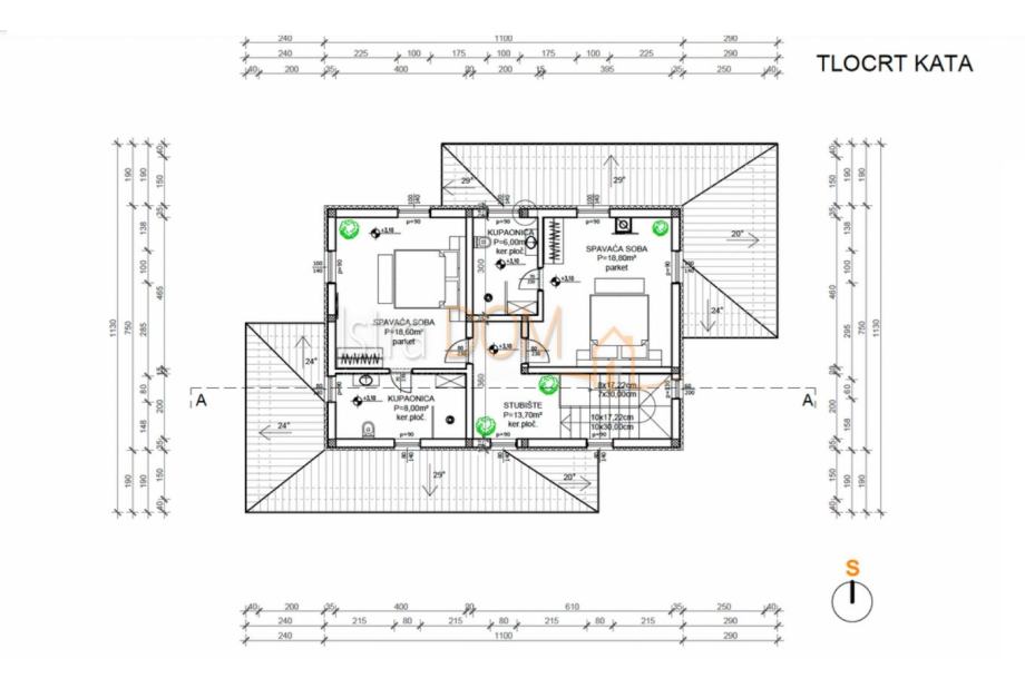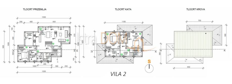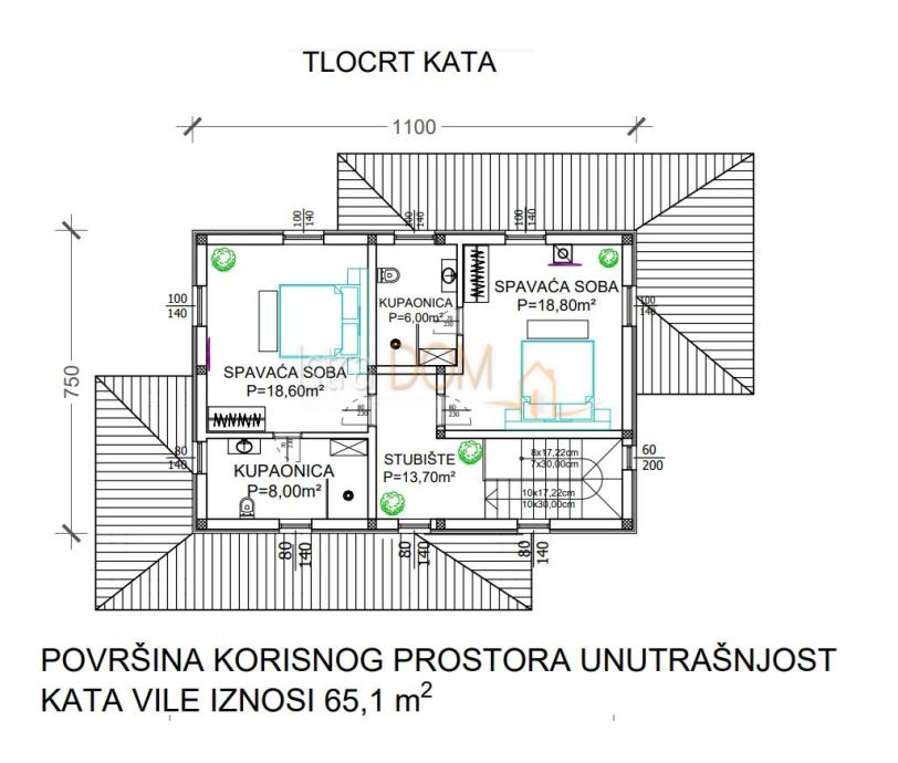 - prvog kata površine 65 m2 gdje se nalaze dvije spavaće sobe s vlastitim kupaonicama te hodnik.