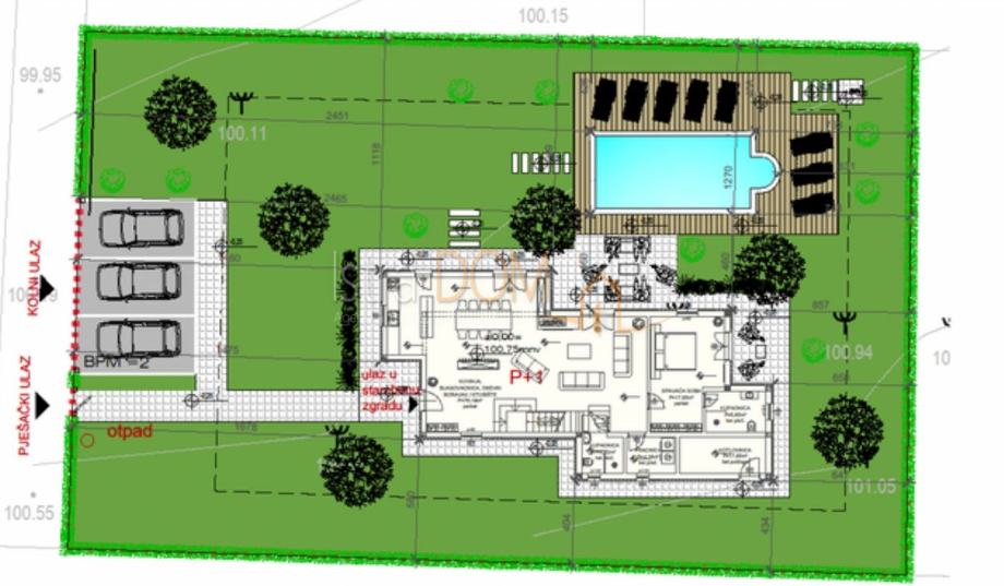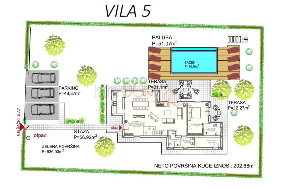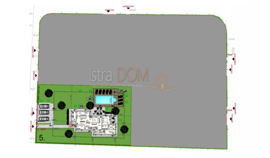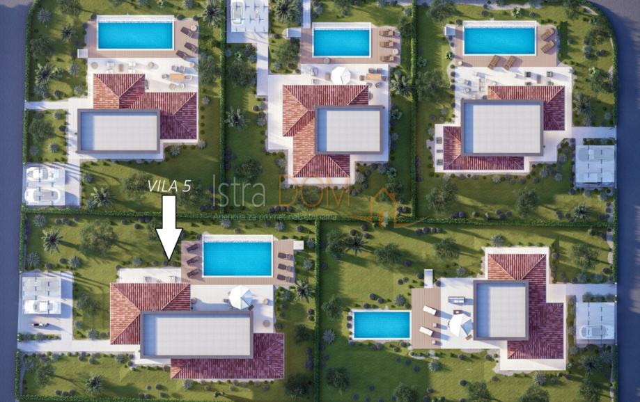 - okućnice površine 872 m2 s infinity bazenom (37 m2), dvije terase (31 m2 i 12 m2), sunčalištem (51 m2), stazom (57 m2), zelenom površinom (636 m2) te parkirnim mjestima (48 m2).