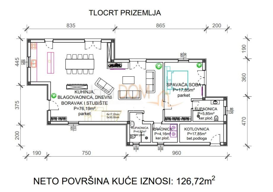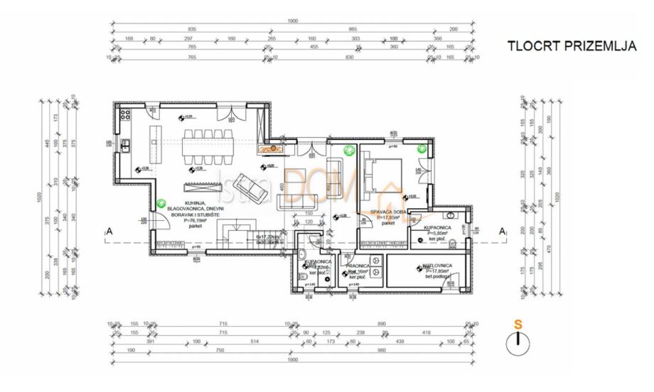 - prizemlja površine 127 m2 gdje se nalazi dnevni boravak s kuhinjom i blagovaonicom, spavaća soba s vlastitom kupaonicom, praonica, gostinjska kupaonica te kotlovnica. Ovaj dio kuće ima izlaz na vanjski bazen i sunčalište s natkrivenom terasom, na nenatkrivenu terasu, vrt te natkrivena parkirna mjesta.