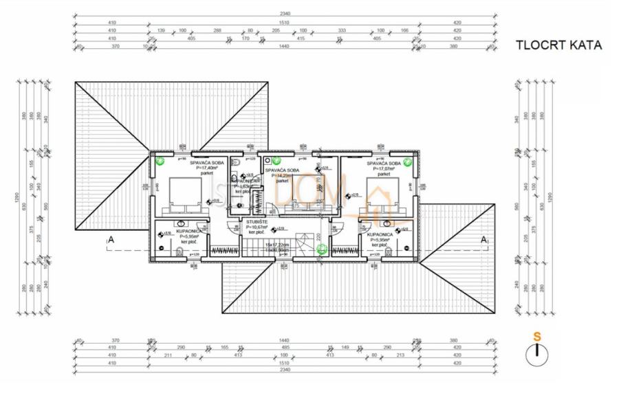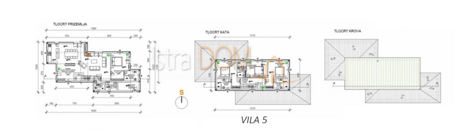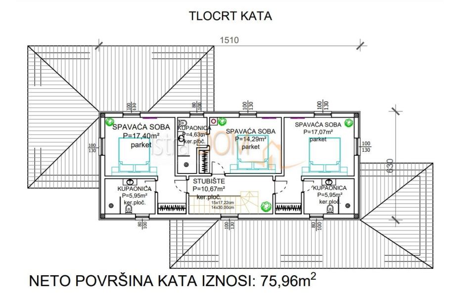 - prvog kata površine 76 m2 gdje se nalaze tri spavaće sobe s vlastitim kupaonicama te hodnik.