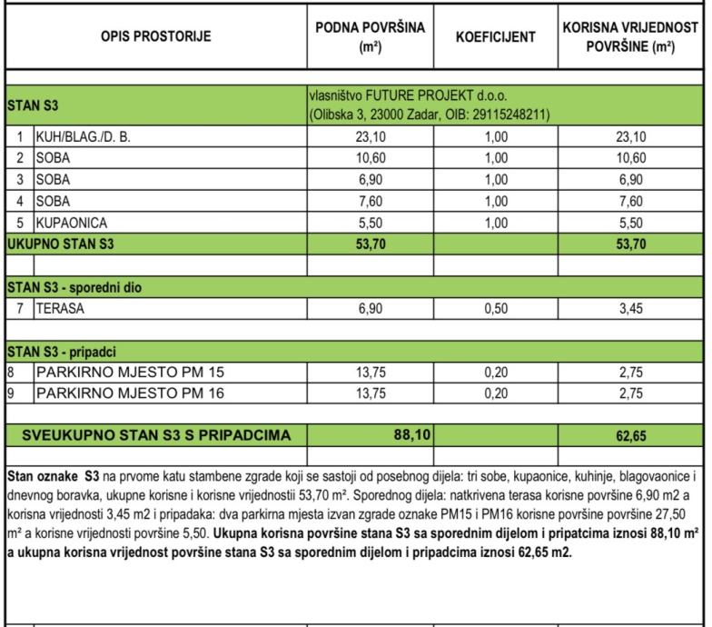 Unutarnja korisna površina stana iznosi 53,70 m2