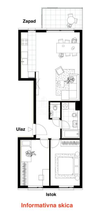 Stan se sastoji od dnevnog boravka s blagovaonicom i kuhinjom, dvije spavaće sobe, kupaonice i wc-a, balkona i hodnika.