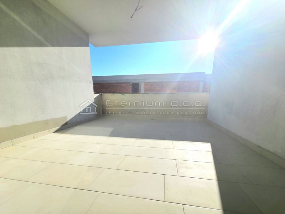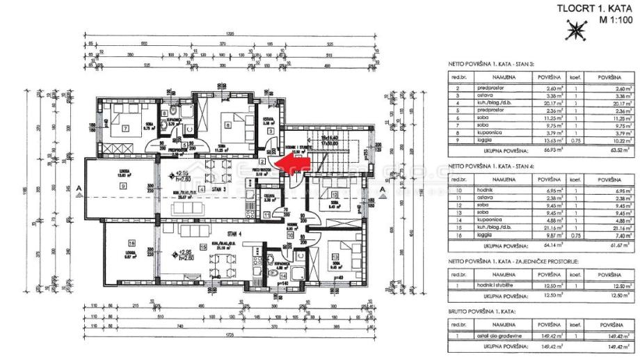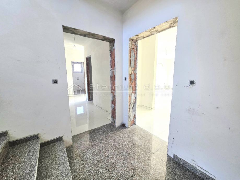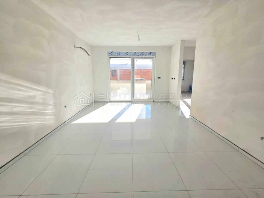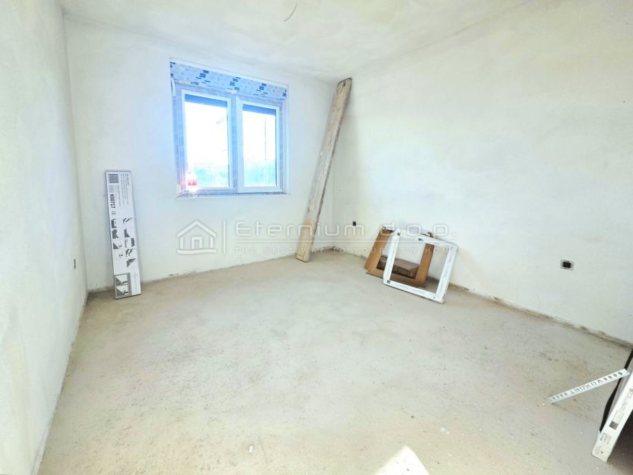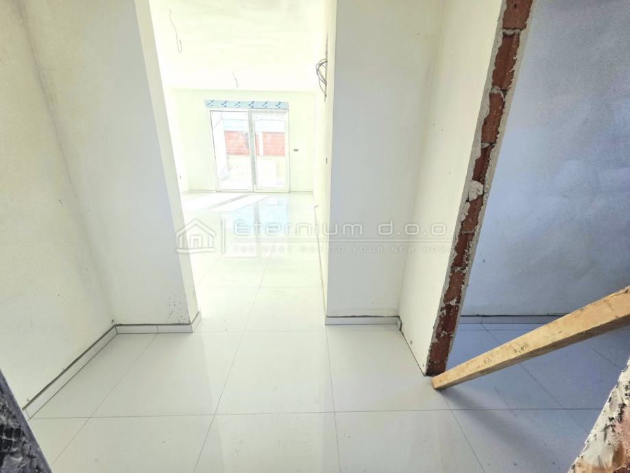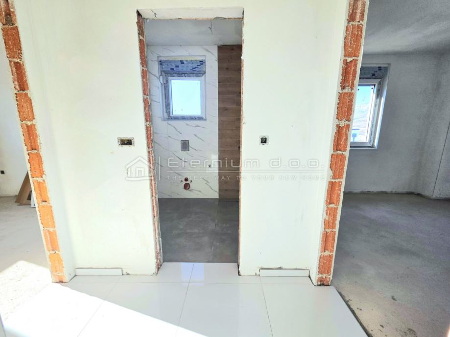 Već smo rekli da se stan nalazi na prvome katu moderne novogradnje, a sastoji se od predulaza odnosno manjeg ulaznoga hodnika, spremišta, open space dnevnoga dijela kojega čine kuhinja sa blagovaonom i dnevni boravak, te spavaćega dijela kojega čine 2 spavaće sobe i kupaona. Iz dnevnoga dijela se izlazi na loggiu površine 13,5m2 sa koje se pruža djelomičan pogled na more i prirodu. Kako je navedeno, stan ima ukupnu površinu od 67m2, dok je prodajna površina 63,50m2 zbog koeficijenta kojim se računa loggia.