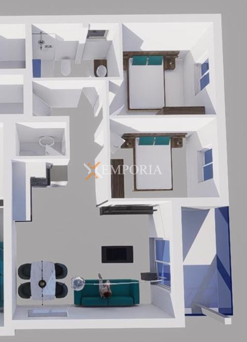 The apartment further includes a storage room in the basement with a surface of 7,20 m², net 3,60 m², as well as one parking space. The total net area including all associated parts amounts to 77,66 m². EquipmentElectric underfloor heating is installed throughout the entire apartment, while air conditioning is provided by three units located in the living room and bedrooms. The building is constructed with reinforced concrete walls and features aluminum joinery with triple glazing, electric shutters, and mosquito screens. The façade is insulated with 12 cm Styrofoam. Floors are finished with tiles, and the entrance door is burglar-resistant and fire-resistant. The roof is new, flat, and made of reinforced concrete.