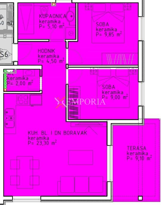 Apartmanu dodatno pripada spremište u podrumu površine 7,20 m², neto 3,60 m², kao i jedno parkirno mjesto. Ukupna neto površina apartmana s pripacima iznosi 77,66 m². OpremaU cijelom apartmanu ugrađeno je električno podno grijanje, dok su postavljene tri klima jedinice u dnevnom boravku i spavaćim sobama. Zgrada je građena betonskim zidovima, a stolarija je aluminijska s troslojnim staklom, električnim roletama i komarnicima. Fasada je toplinski izolirana stiroporom debljine 12 cm. Podovi su obloženi pločicama, ulazna vrata su protuprovalna i protupožarna, a krov je nov, ravan i betonski.