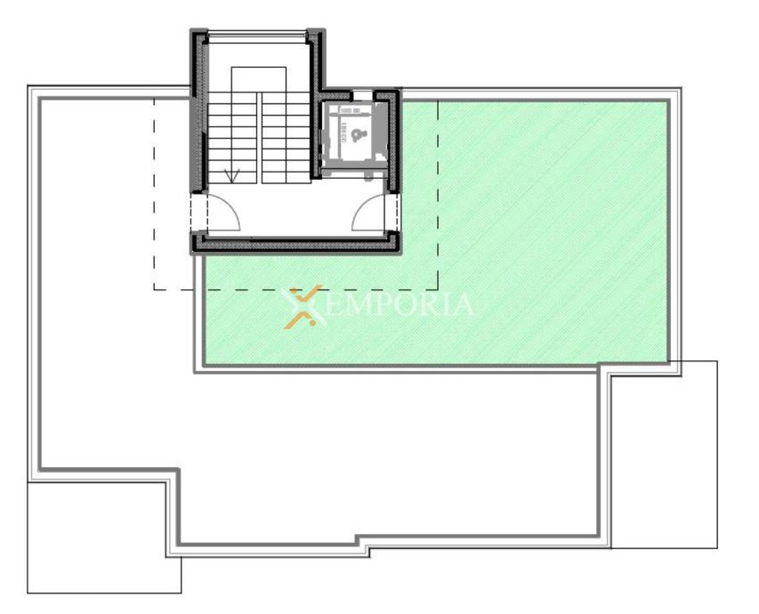 The apartment is located on the second floor of a modern building with a lift that connects the basement to the rooftop terraces. The layout includes an entrance hall, two bedrooms, a bathroom, and a kitchen with dining area and living room with access to a covered terrace. The net surface area of the interior living space with the covered terrace amounts to 58,30 m². From the staircase, there is access to a private rooftop terrace with a total surface of 45,15 m², of which 6,85 m² is covered, providing an exceptional outdoor living area. The net usable area of the described spaces amounts to 71,31 m².
