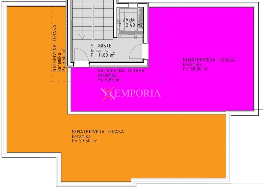 Apartman je smješten na drugom katu moderne zgrade s liftom, koji ide od podruma sve do krovnih terasa. Raspored prostorija obuhvaća hodnik, dvije spavaće sobe, kupaonicu te kuhinju s blagovaonicom i dnevnim boravkom s izlazom na natkrivenu terasu. Neto površina stambenog dijela s terasom iznosi 58,30 m². Iz stubišta se pristupa krovnoj terasi površine 45,15 m², od čega je 6,85 m² natkriveno, što pruža dodatni komfor i prostor za boravak na otvorenom. Neto korisna površina opisanih prostorija iznosi 71,31 m².