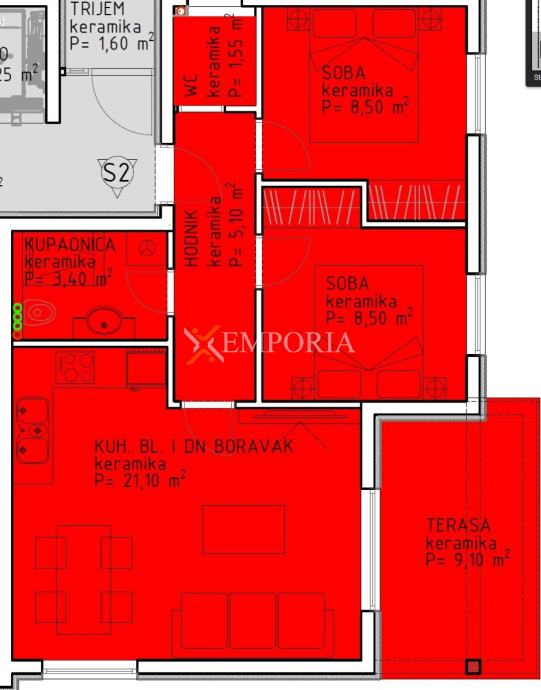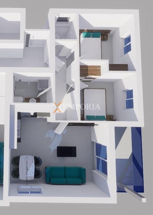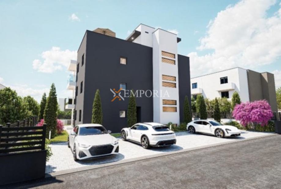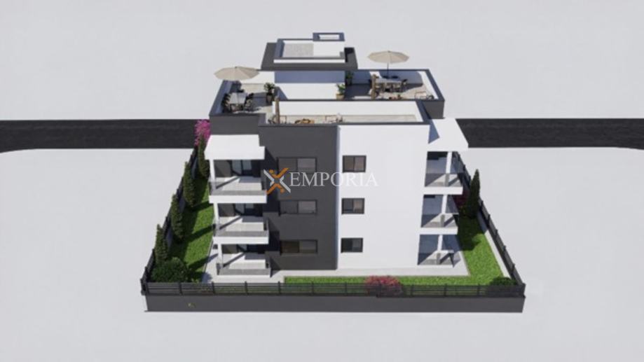 Apartman se nalazi u prizemlju moderne zgrade s liftom. Raspored prostorija čine hodnik, dvije spavaće sobe, kupaonica, kuhinja s blagovaonicom i dnevnim boravkom te natkrivena terasa. Neto korisna površina stambenog dijela iznosi 52,70 m². Stanu dodatno pripada vrt površine 68 m² te popločano dvorište od 20 m², što ukupno čini 88 m² vanjskog prostora. U podrumu zgrade nalazi se spremište površine 5,90 m², odnosno neto 2,95 m², dok je osigurano i jedno parkirno mjesto. Ukupna neto površina apartmana s pripacima iznosi 69,20 m².OpremaU cijelom apartmanu ugrađeno je električno podno grijanje, a klimatizacija je riješena s tri klima uređaja u dnevnom boravku i spavaćim sobama. Zgrada je građena betonskim zidovima te ima aluminijsku stolariju s troslojnim staklom, električnim roletama i komarnicima. Fasada je toplinski izolirana stiroporom debljine 12 cm. Podovi su obloženi pločicama, ulazna vrata su protuprovalna i protupožarna, a krov je nov, ravan i betonski.