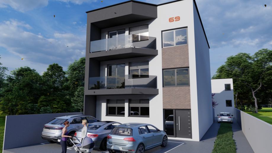 Četverosobni stan na 2 katu zgrade do ulice, ukupne površine od 84m2 (tlocrt 1), a koji se sastoji od ulaznog prostora, dnevne sobe sa kuhinjom i blagovaonicom sa izlazom na loggiu/balkon ukupne površine 10,53m2, te tri spavaće sobe i kupaonice + parkirno mjesto...ukupna cijena s PDV-om 215.000 eura i