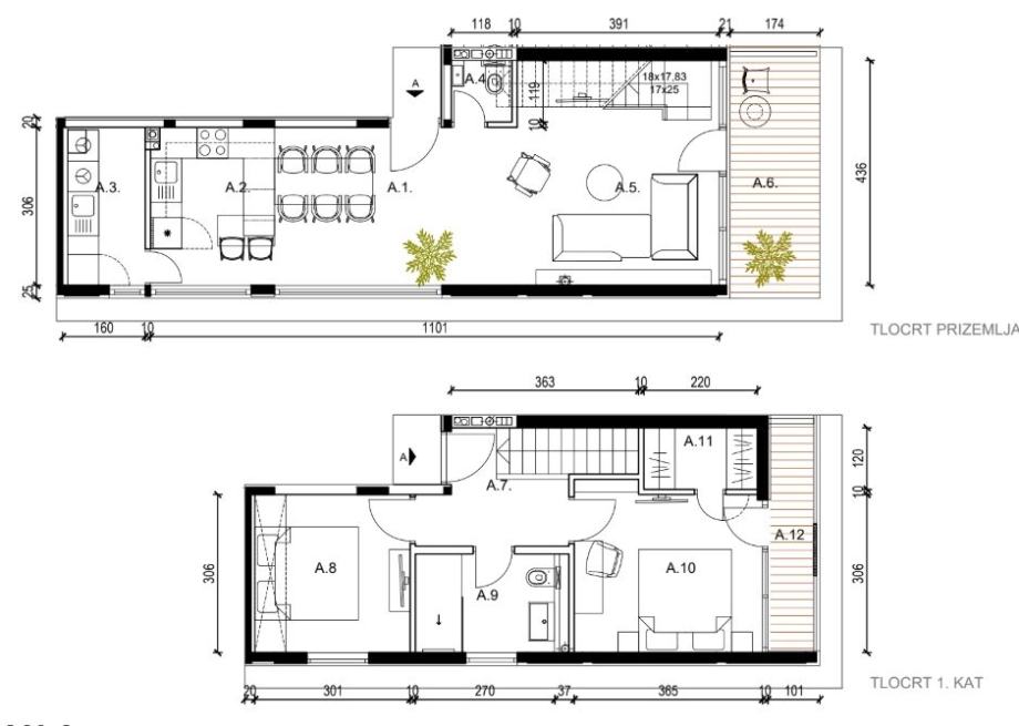 Stan A prostire se na ukupno 104,97 m² obračunske površine, s neto korisnom površinom od 87,03 m². Orijentiran na jug i zapad, ispunjen je prirodnim svjetlom kroz dan. Prizemlje uključuje ulazni prostor, wc, ostavu, kuhinju s blagovaonicom i dnevni boravak s unutarnjim stubištem, dok kat donosi dvije spavaće sobe, garderobu, kupaonicu i loggiu. Vanjski dio upotpunjen je natkrivenom terasom, vrtom i dvorištem.
