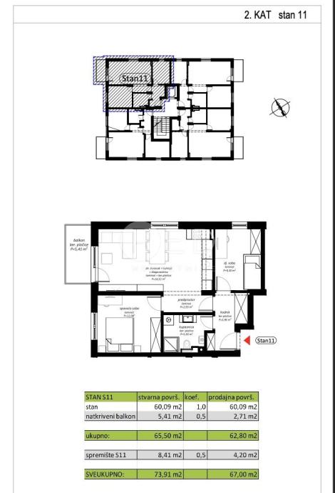 Stan unutarnje površine 60,09 m² sastoji se od: hodnika, predprostora, dnevnog boravka s blagovaonicom i kuhinjom, spavaće sobe, dječje sobe i kupaonice