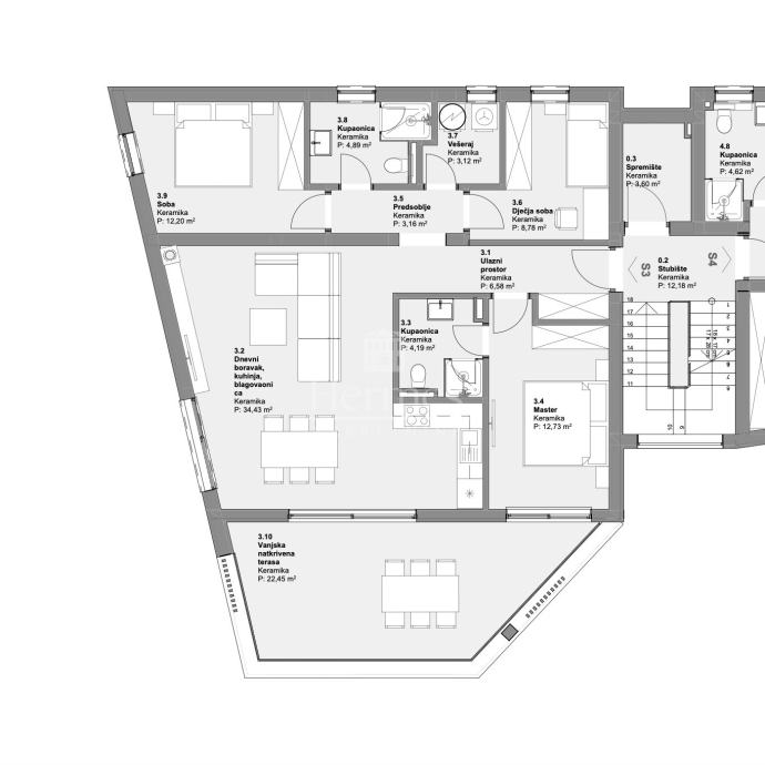 Stan S3 nalazi se na 1. katu zgrade, a prostire se na 90,08 m2 unutarnje stambene kvadrature + 22,45 m2 natkrivene terase. Sastoji se od 3 spavaće sobe, open space dnevnog boravka, kuhinje i blagovaonice, 2 kupaonice s WC-ima, vešeraja, ulaznog hodnika i natkrivene terase. Stanu pripada i vanjsko parkirno mjesto (uključeno u cijenu). Ukupna obračunska / prodajna kvadratura stana je 101,30 m2 (natkrivena terasa je obračunata po koeficijentu 0,5).