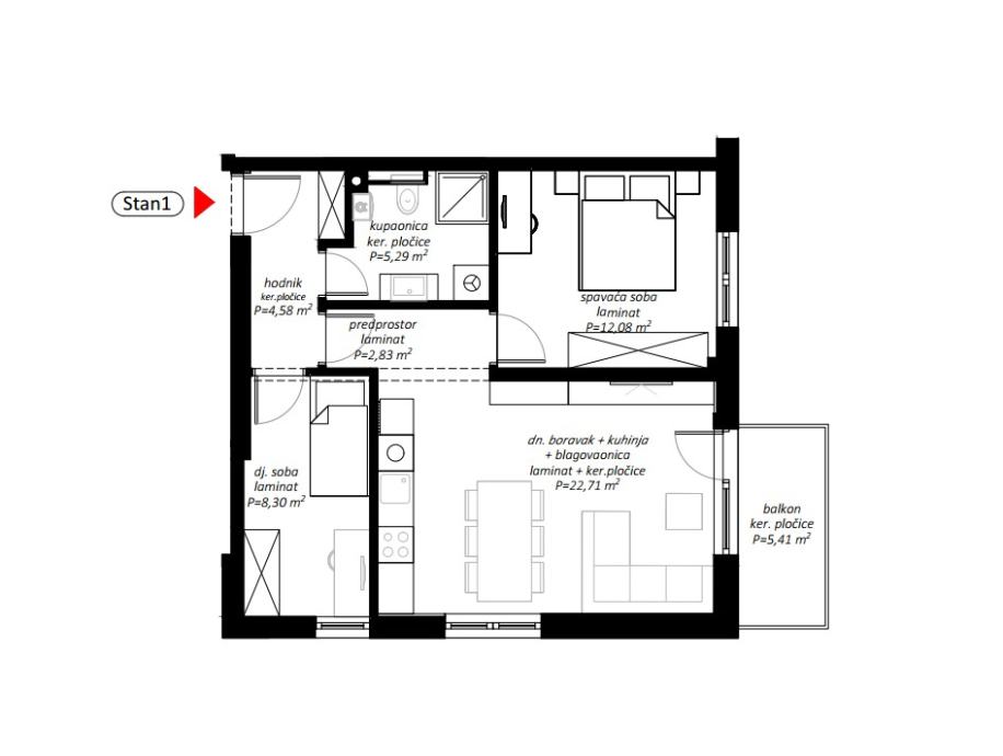 Stan S1 – prizemlje 68,16m2 (NKP 61,98m2)