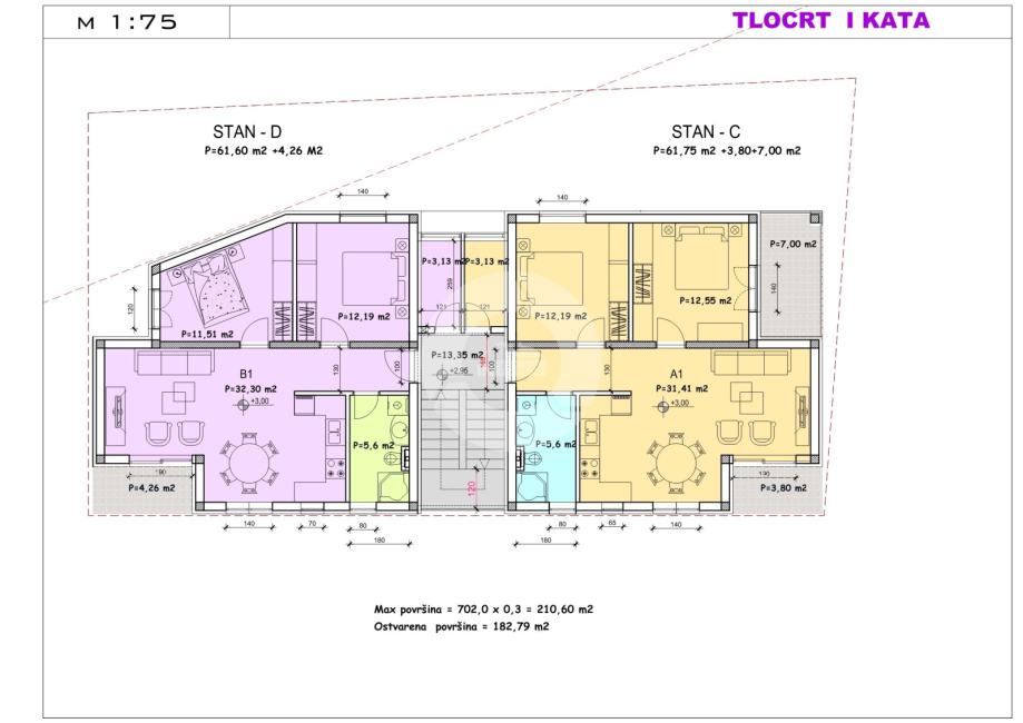 Sastoji se od hodnika, dvije spavaće sobe (12,19 m2, 12,55 m2), kupaone (5,6 m2), kuhinje s blagovaonom i dnevnim boravkom (31,41 m2). Iz blagovaone i dnevnog boravka izlazi se na terasu od 3,80 m2, te iz veće spavaće sobe izlazi na terasu od 7 m2. Ukupna površina stana je 61,75 m2 + terase 10,80 m2+3,13 m2 spremište.