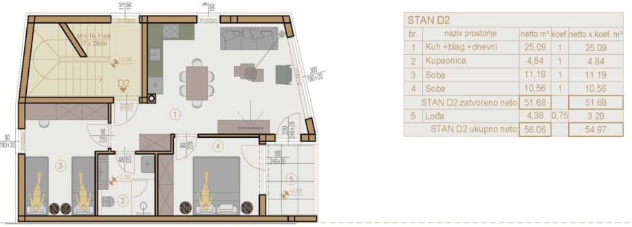 Stan oznake D2 neto površine 55 m2 nalazi se na 1.katu zgrade s ukupno četiri stambene jedinice, u mirnoj i traženoj urbanoj zoni, idealnoj za sve koji žele spoj privatnosti i praktičnosti.