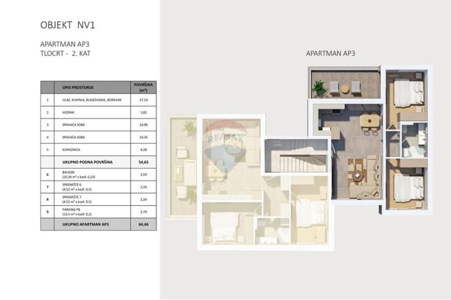Stan A3 koji se nalazi na DRUGOM katu, sastoji se od DVIJE spavaće sobe, hodnika, kupaonice, kuhinje/dnevnog boravka/blagovaonice, balkona.