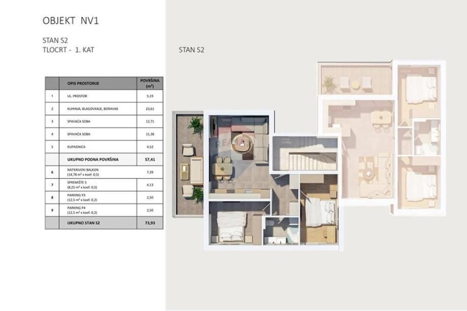 Stan S2 koji se nalazi na prvom katu, sastoji se od DVIJE spavaće sobe, hodnika, kupaonice, kuhinje/dnevnog boravka/blagovaonice, balkona.