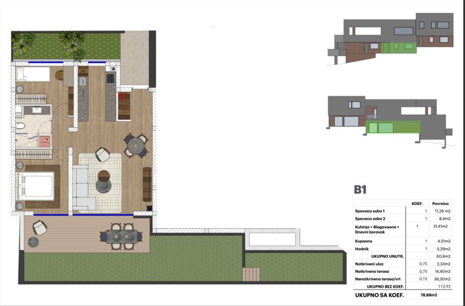 Stan se sastoji od: hodnika(5,29m2), spavaće sobe 1(11,29m2), spavaće sobe 2 (8,40m2), dnevnog boravka s blagavaonicom i kuhinjom(31,41m2), kupaonice(4,51m2), ukupne unutarnje površine 60,9 m2. Također pripada mu još natkriveni ulaz(2,33m2), natkrivena terasa(14,40m2) i nenatkrivena terasa/vrt(36,30m2).