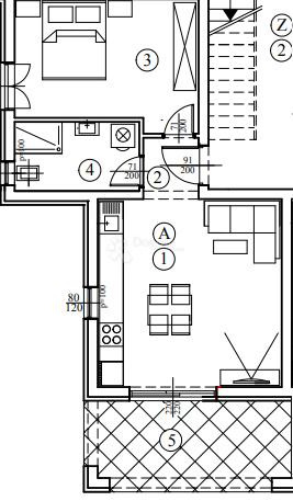 Stan se sastoji se od dnevnog boravka s kuhinjom, koji čine otvoren i svijetao prostor za boravak. Hodnik vodi do spavaće sobe te suvremeno opremljene kupaonice. Iz dnevnog boravka izlazi se na terasu, savršeno mjesto za jutarnju kavu ili opuštanje nakon radnog dana.